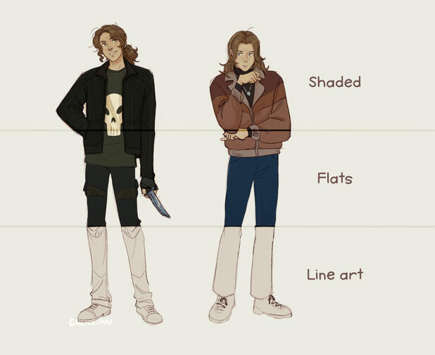 - please also try to provide visual references for your characters! they're not mandatory, but $20 is added to the price of the piece if the only provided reference is text. for example, a picrew with some images of similar clothing and text notes would count as a visual reference :-)